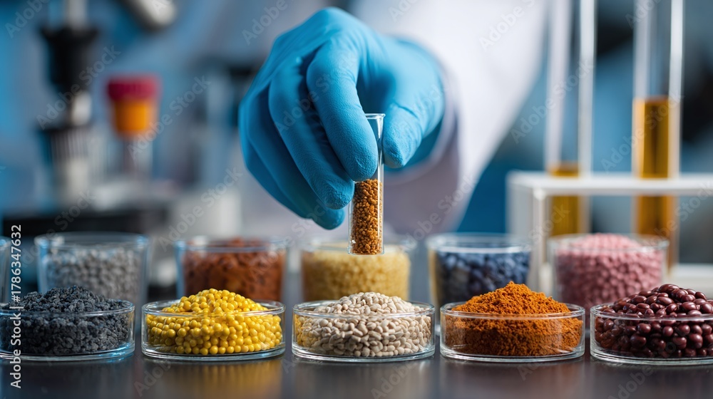 Scientist examines seed variations in test tubes. A gloved hand carefully holds a sample, set against diverse seeds in lab containers, ready for food technology innovations. #1786347632