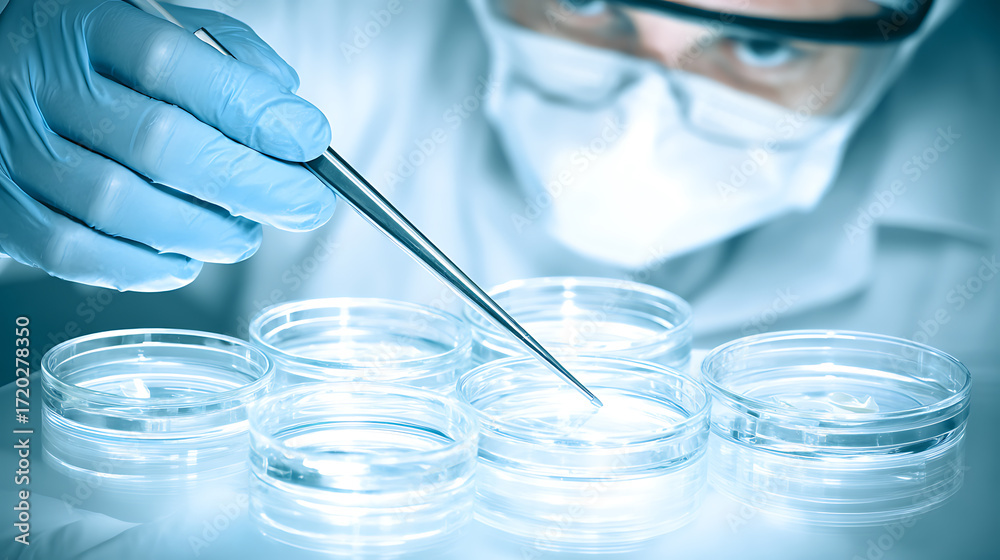Scientist examining samples in petri dishes using tweezers in a laboratory setting #1720278350