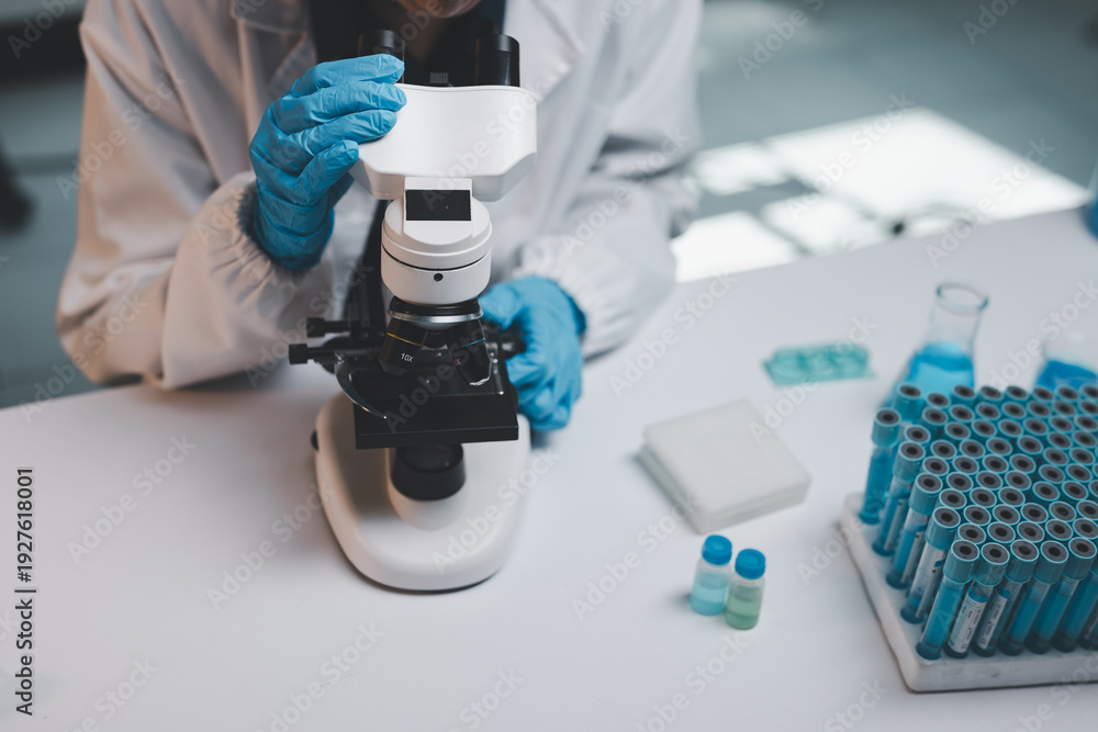 Scientist examining samples with microscope in laboratory research #1927618001