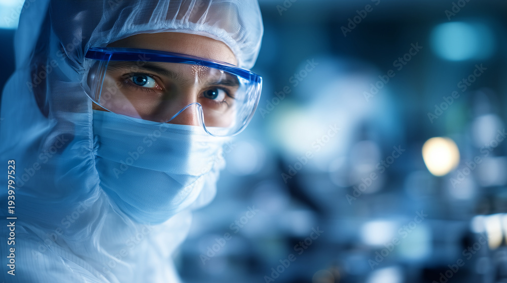 Scientist in Cleanroom Suit Working in Nanotechnology Laboratory portrait of a scientist wearing a full cleanroom protective suit, mask, goggles and hood inside a high-tech nanotec #1939797523