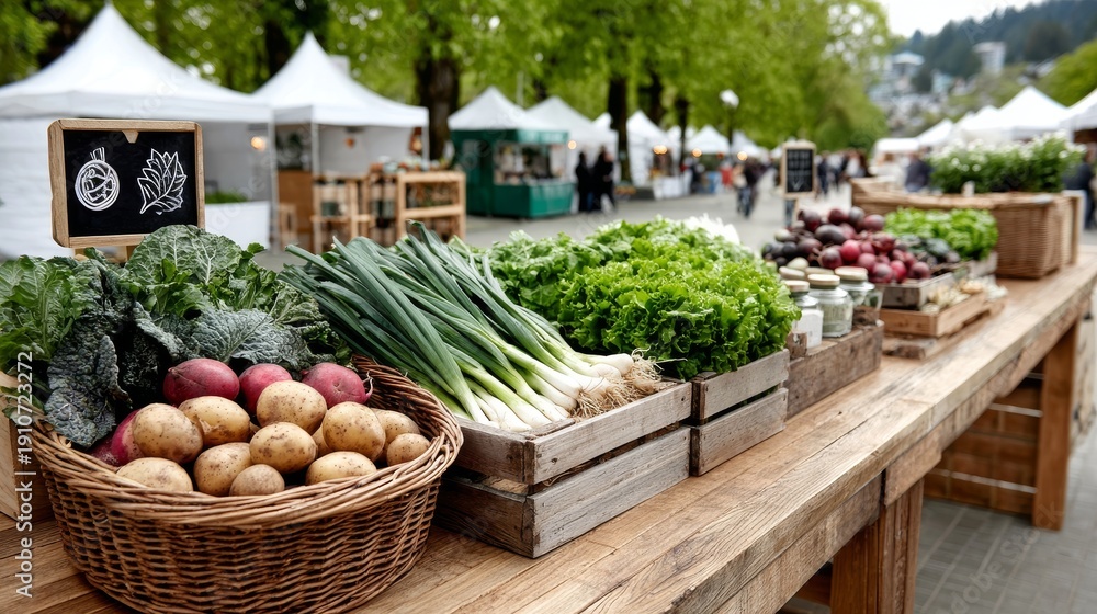 Se observa una mesa larga con cestas y cajas de papas, cebollas y hierbas verdes expuestas en un mercado exterior con carpas blancas y entorno natural iluminado por luz de día. #1910723272