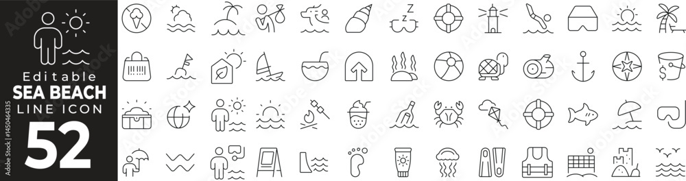 Sea Beach & Ocean Icon Set: A Line Icon Collection Featuring Waves, Sand, Sun, Ocean Life, Beach Activities, and More #1450464335