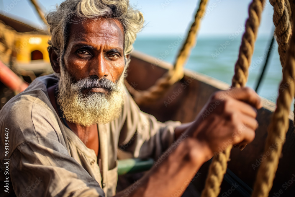 Sea boat fisher. Indian man working in seafood industry. Portrait on small fishing vessel. Generative AI #631934477