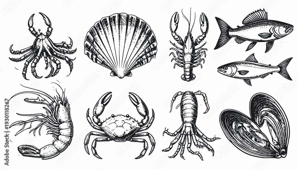 Sea creature drawing: crab, oyster, lobster, shrimp, fish #1930118267