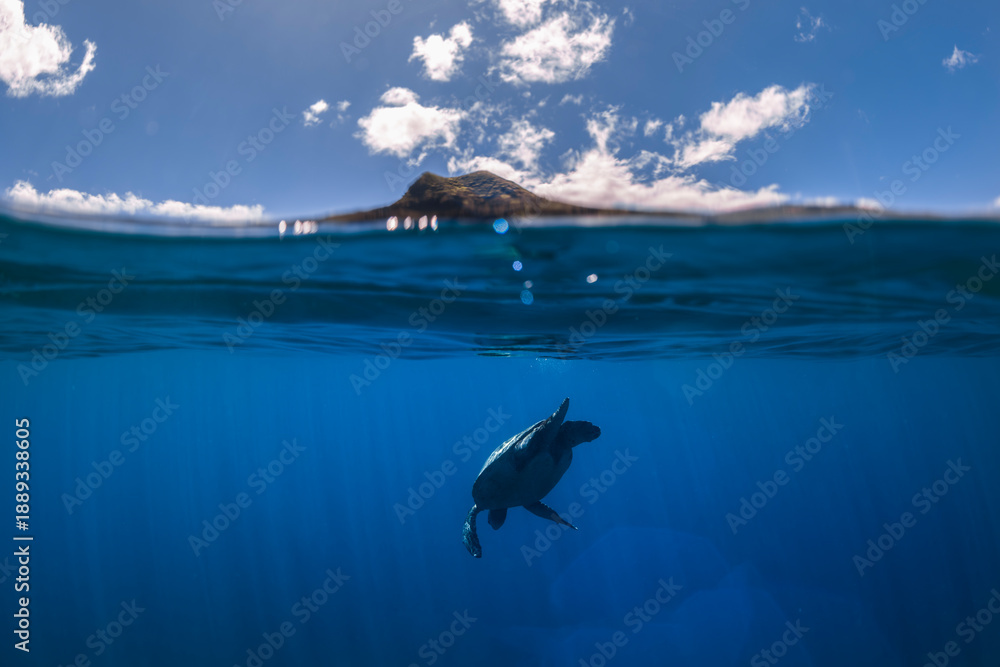 Sea turtle swimming beneath the ocean surface with island coastline above water on the west coast of Oahu, Hawaii, captured in clear blue tropical water. #1889338605