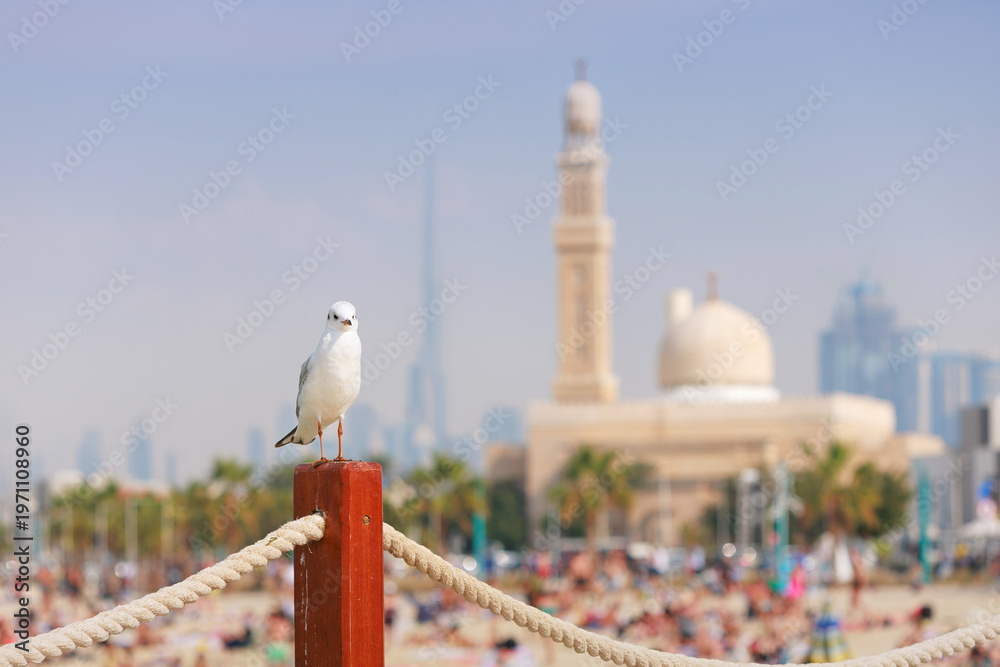 Seagull perching a wooden pole on a vibrant beach, with mosque and skyscrapers dominating the Dubai skyline #1971108960