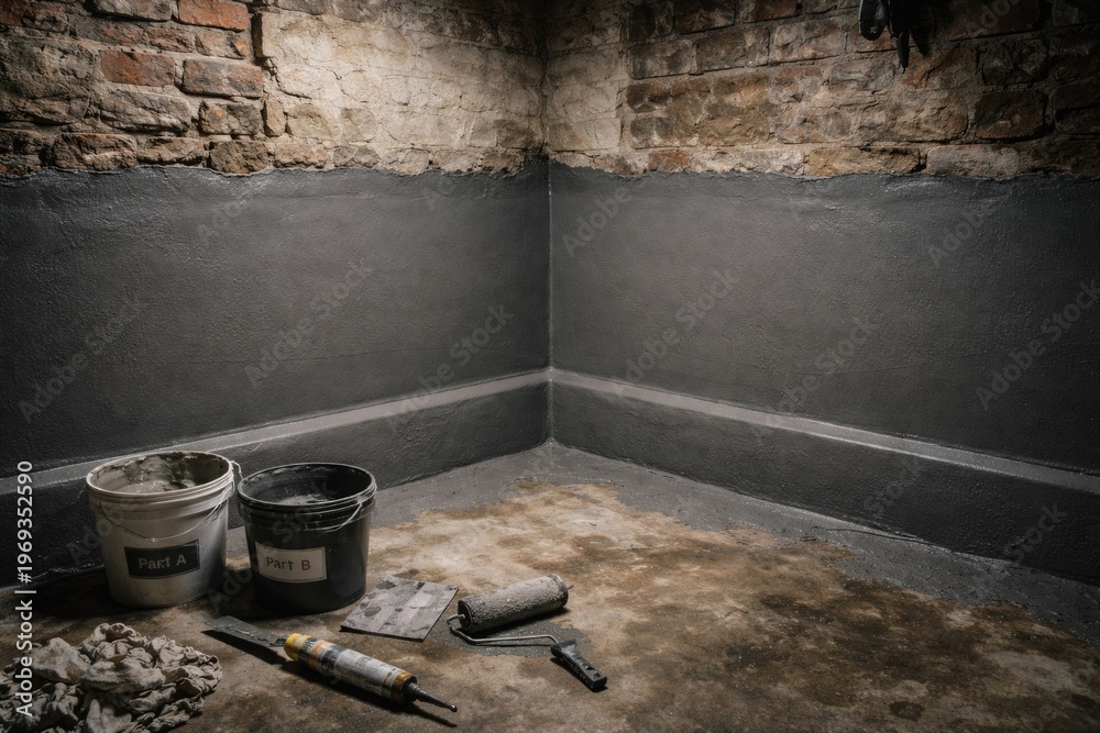 Sealed basement corner in an old house with dual component cement membrane application #1969352590