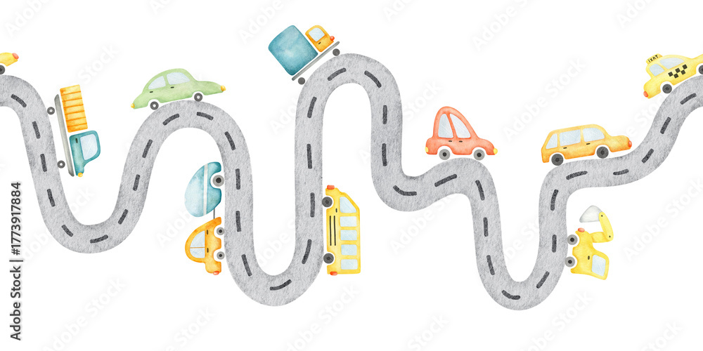 Seamless border of colorful retro cars on winding asphalt road. Watercolor hand drawn kids background of of city street. Baby endless banner of highway with engine for children goods #1773917884