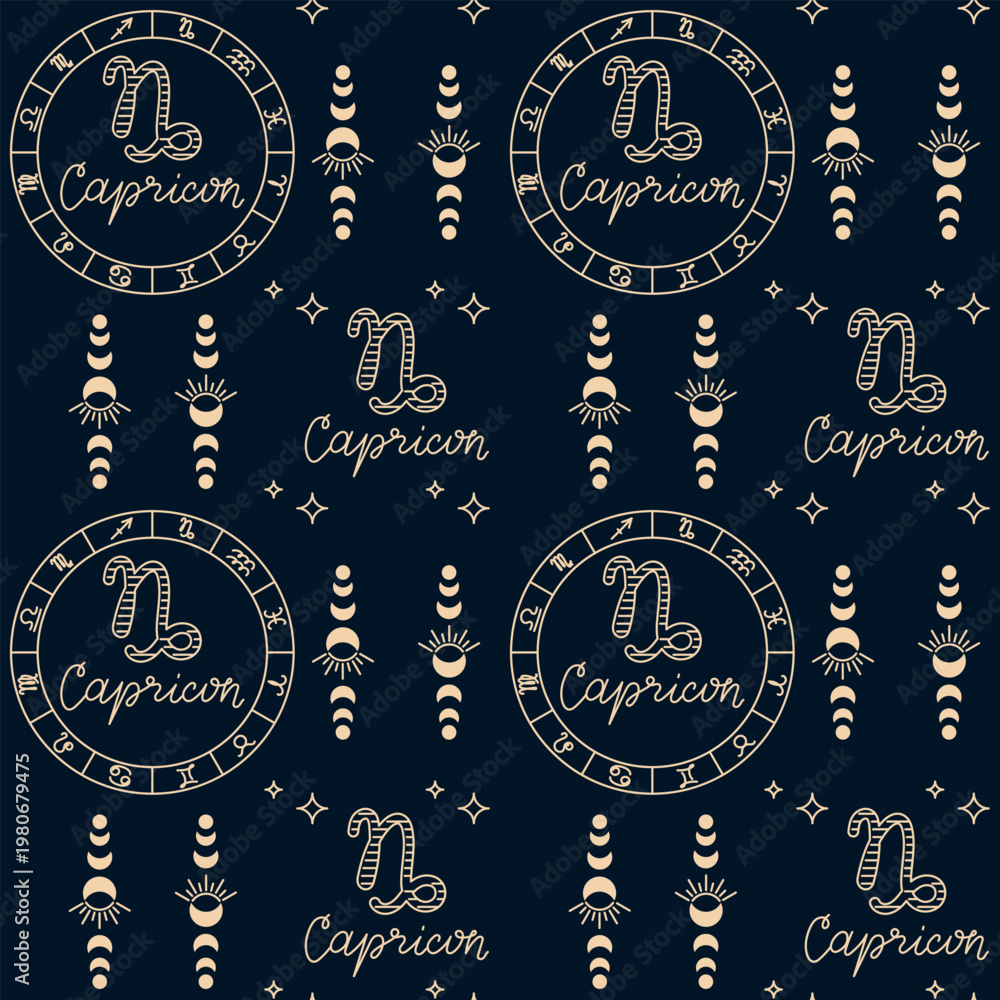 Seamless design showcasing Capricorn zodiac symbols, astrological elements, and celestial motifs on a dark background, suitable for various decorative applications #1980679475