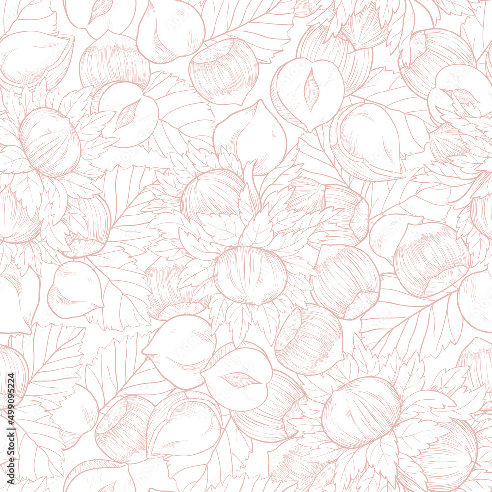 Seamless pattern Hazelnut many fruit nuts and kernels in sketch style. Pale pink background for packing hazelnut or chocolate, nut paste #499095224