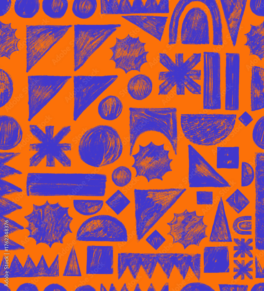 Seamless pattern with bold brutal geometric shapes and playful crayon scribbles. Hand drawn childish doodles, brush strokes and funky abstract figures for modern graphic vector backgrounds. #1762348376