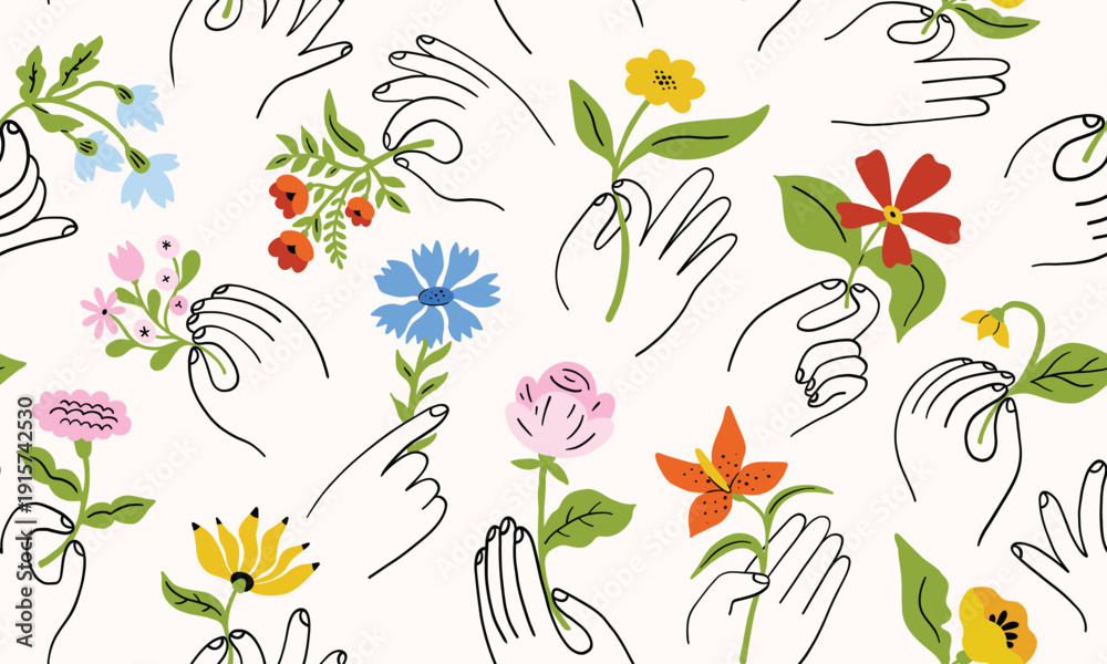 Seamless pattern with hands and flowers. Cute spring or summer floral print. Doodle hands holding wildflowers. For 8 March, Mother's day, women's day. Feminine background for websites, print, fabric. #1915742530