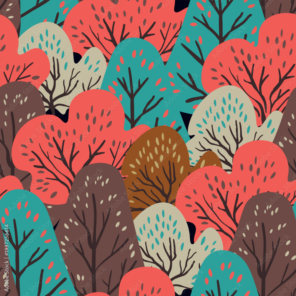 Seamless pattern with trees, plants. Color vector background. Spring, autumn tree for your design. Eco idea concept. Print design for wallpapers, fabric, textile. #1937256614