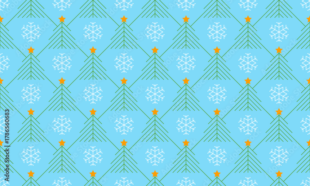 Seamless vector linear geometric winter Christmas tree and white snowflakes pattern on blue sky. Green line, golden star art deco background. Spruces and snow flakes design wrapping paper #1786560683