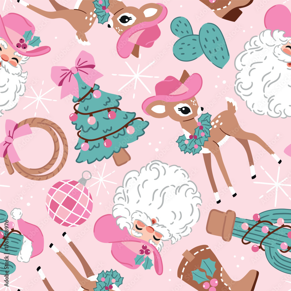 Seamless vector pattern with cowboy Santa Claus and vintage Christmas deer. Hand drawn western pattern with cactus and Christmas tree. #1761808976