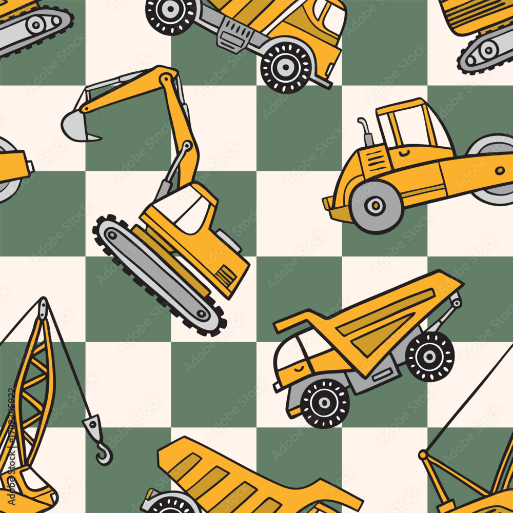Seamless vector pattern with hand drawn construction trucks on checkered background. Perfect for textile, wallpaper or nursery print design. EPS10 vector file. #1702365922