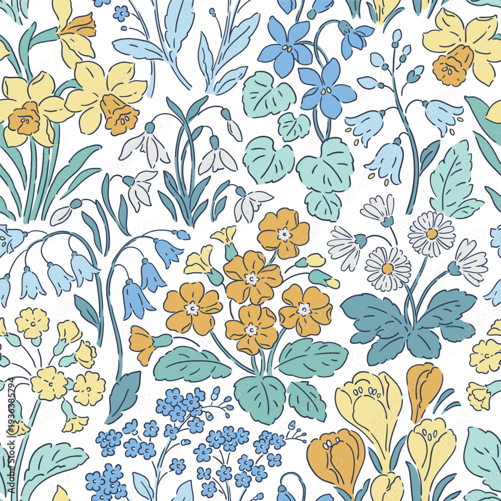 Seamless vector pattern with spring flowers. Hand drawn liberty floral design on isolated background. Snowdrop, crocus, hyacinth, primrose, daffodils, bluebell and violet. #1936385794