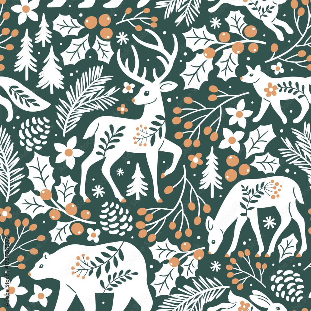 Seamless vector pattern with woodland animals, tree, berry and leaves. Hand drawn illustration of wildlife and nature. Perfect for textile, wallpaper or print design. #1734268776