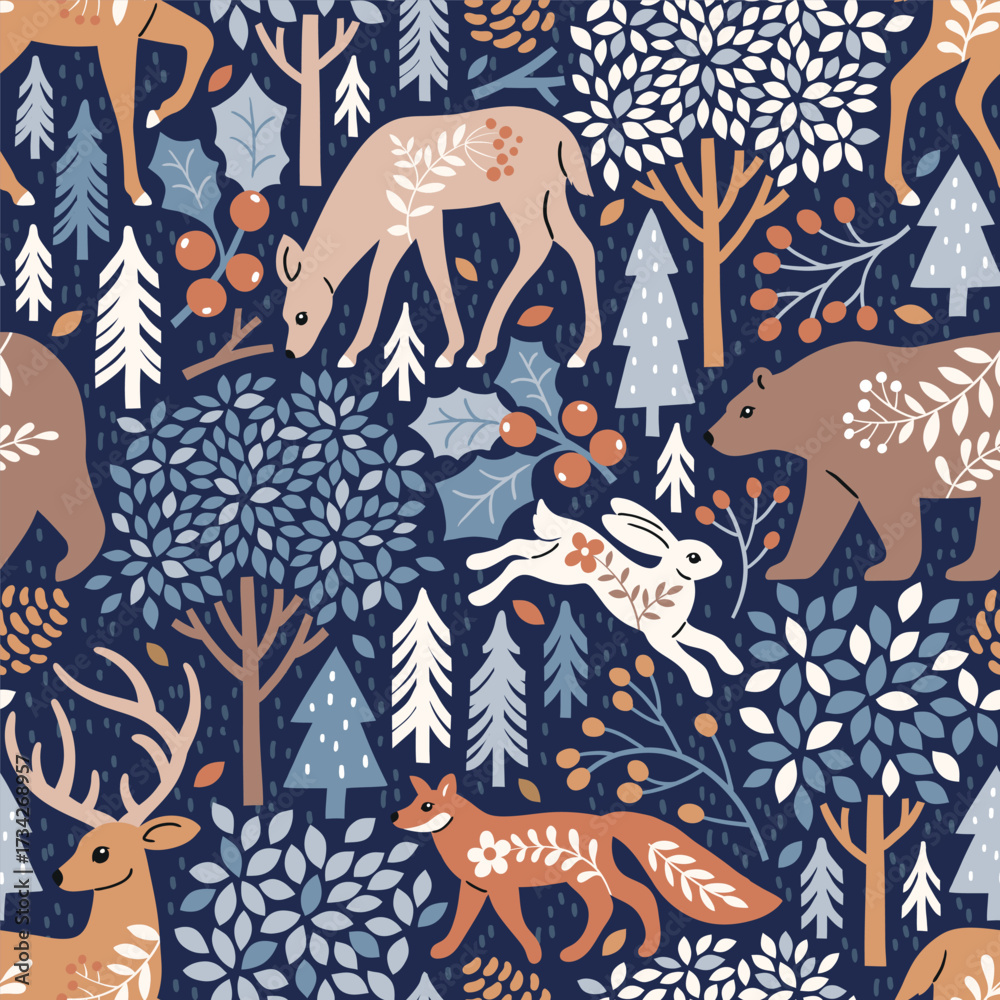 Seamless vector pattern with woodland animals, tree, berry and leaves. Hand drawn illustration of wildlife and nature. Perfect for textile, wallpaper or print design. #1734268957