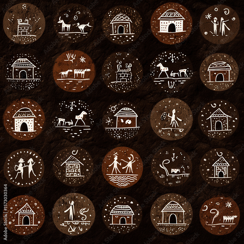 Seamless Warli Pattern Featuring Humans, Huts, and Animals in Artistic Motifs #1573030364