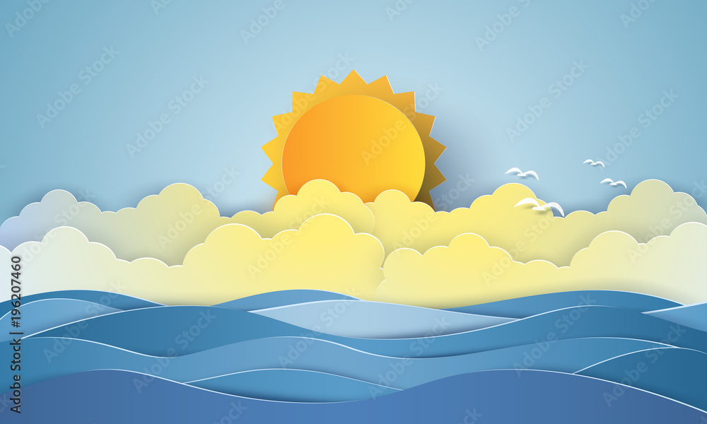 Seascape , blue sea with flock of birds , cloud and sun , paper art style #196207460