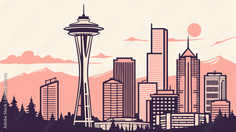 • #1909469652 Seattle skyline with the iconic space needle, perfect for travel brochures, city guides, websites, blogs, social media posts, and posters.