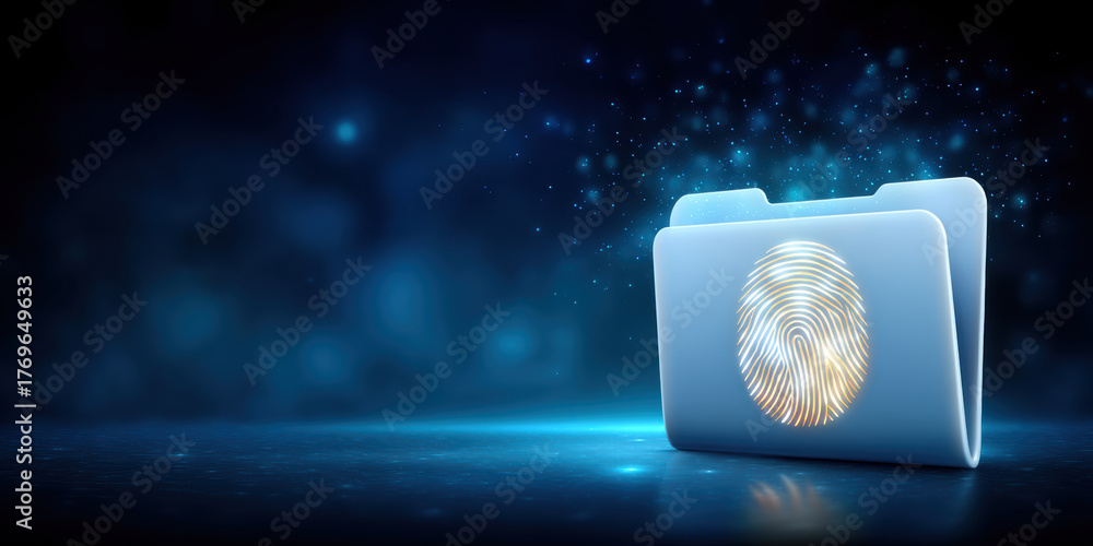 Secure folder with glowing fingerprint symbol data security and privacy protection concept illuminated on dark blue background with bokeh lights #1769649633