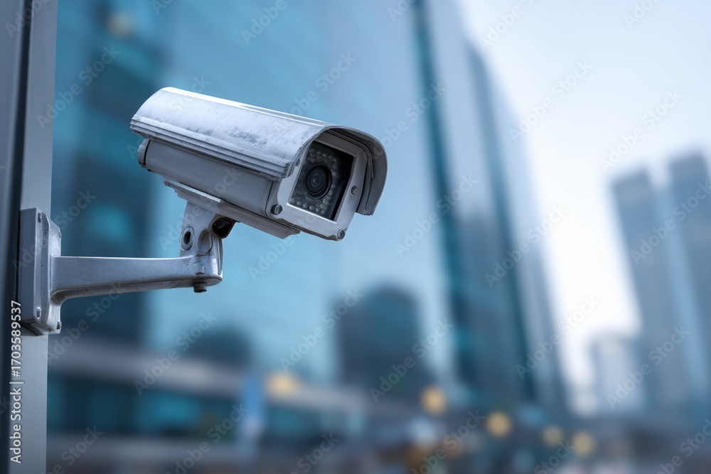 Security camera on a building exterior. Cityscape background #1703589537