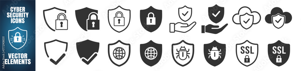 Security shield icons set. Data protection and online safety vector elements on transparent background #1772908031