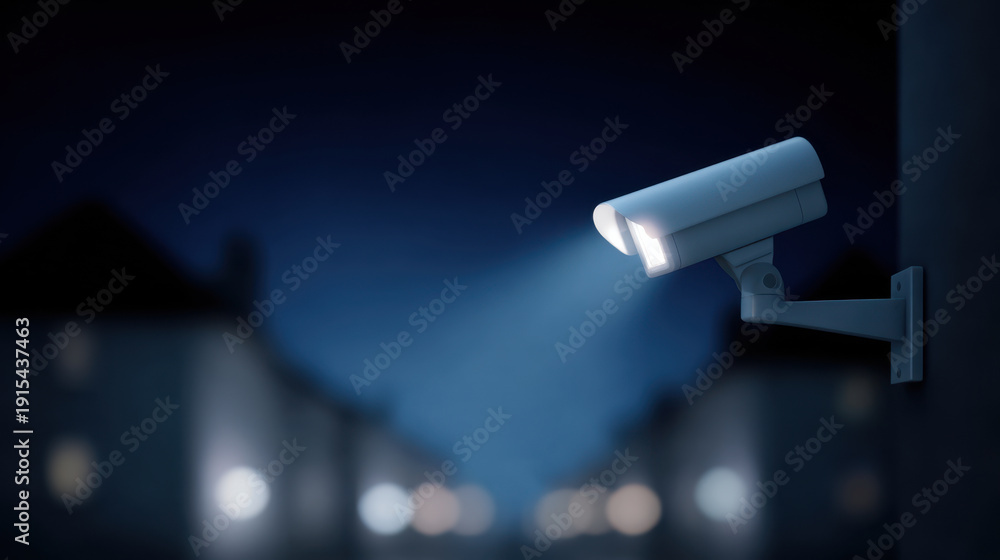 Security surveillance camera illuminated at night monitoring outdoor area with blurred background lights #1915437463
