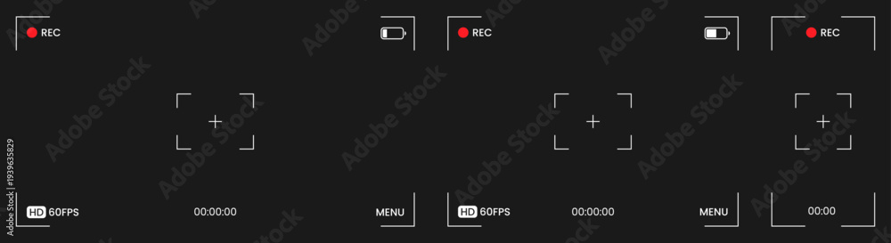 Security viewfinder camera overlay set. Isolated white camera screen interface frame collection on black background. Surveillance webcam, TV or phone empty camera focus footage. Vector illustration. #1939635829