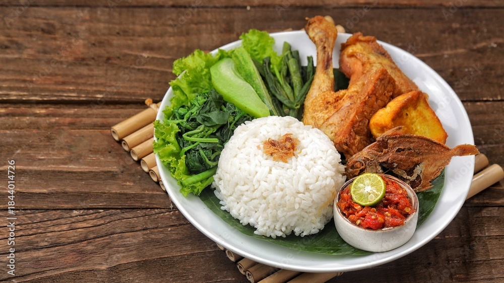 Sego tempong or nasi tempong is a traditional Banyuwangi dish served with various side dishes, fresh vegetables, and special chili sauce #1844014726