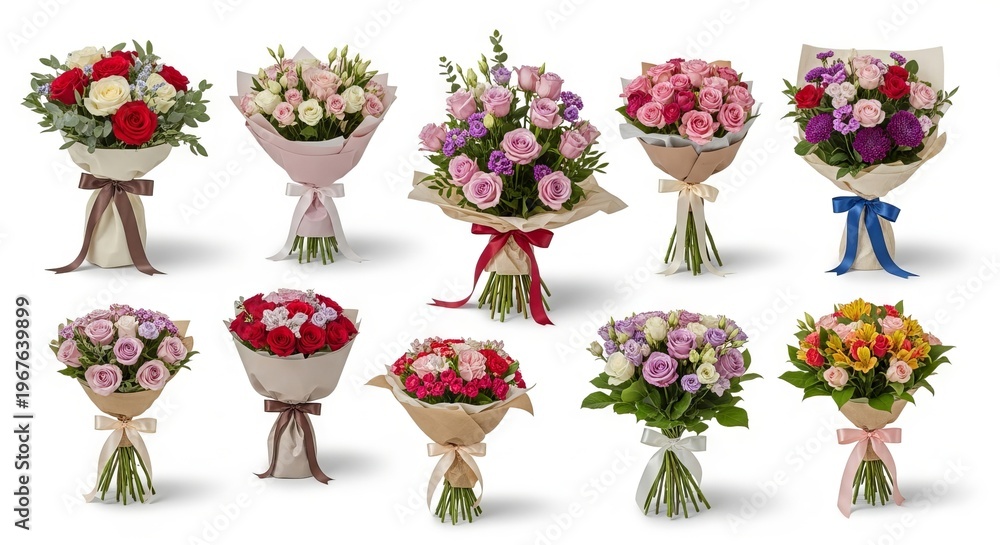 Selection of colorful flower bouquets wrapped in craft paper isolated on white background. Spring and romantic floral arrangements for wedding, anniversary, birthday celebration or Valentine day gift #1967639899