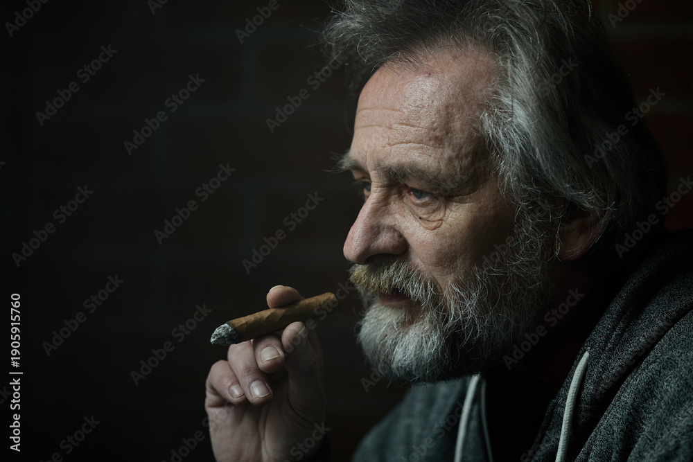 Senior bearded man smoking on balcony classic big cigar in detail #1905915760