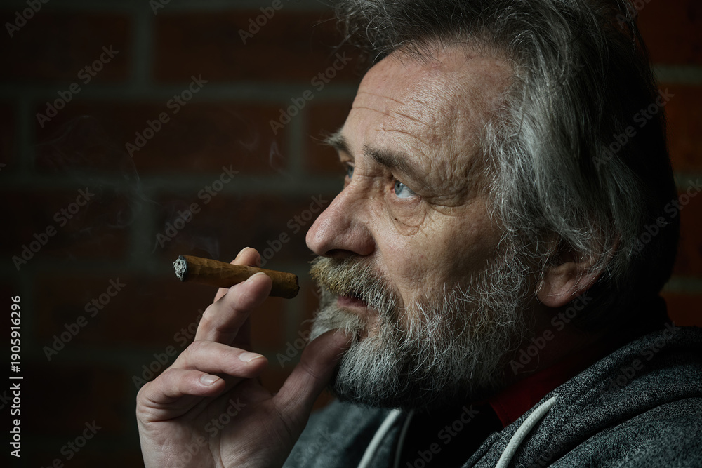 Senior bearded man smoking on balcony classic big cigar in detail #1905916296