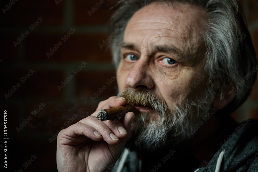 Senior bearded man smoking on balcony classic big cigar in detail #1905917319