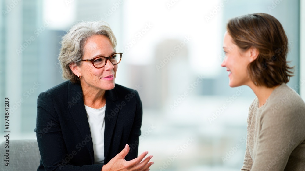 Senior businesswoman mentoring a young professional in modern office, career coaching meeting #1774871209