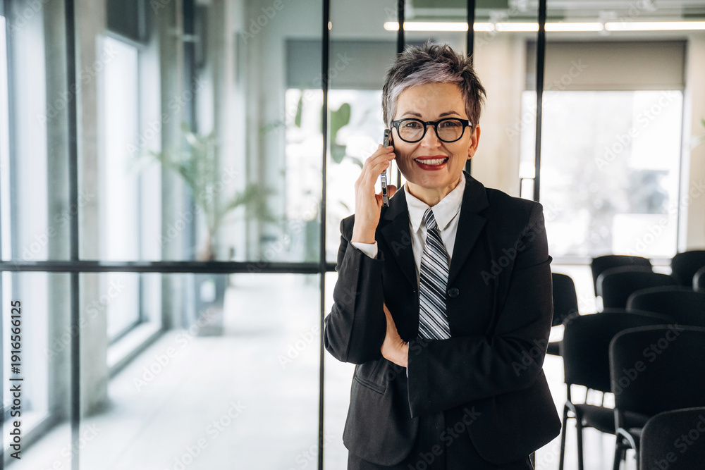 Senior businesswoman with short gray hair wearing a black suit and tie smiles while talking on a smartphone inside a modern office with glass walls #1916566125
