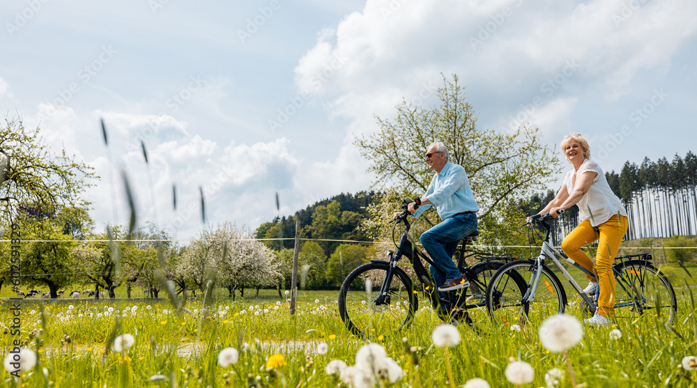 Senior coSenior couple riding bicycles in spring through a meadowuple riding bicycles in spring #602591329