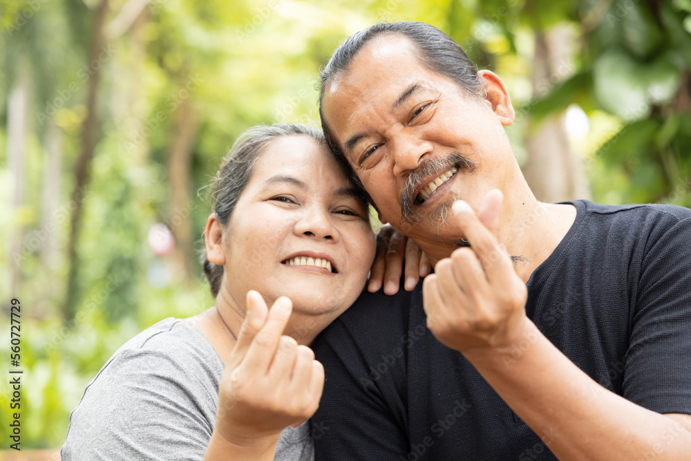 Senior couple, healthy old aging husband and wife showing asian style mini heart hand gesture #560727729