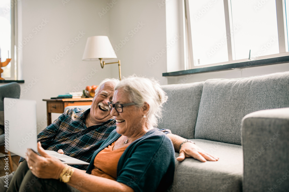 Senior couple laughing together while watching something on laptop at home #1599186060