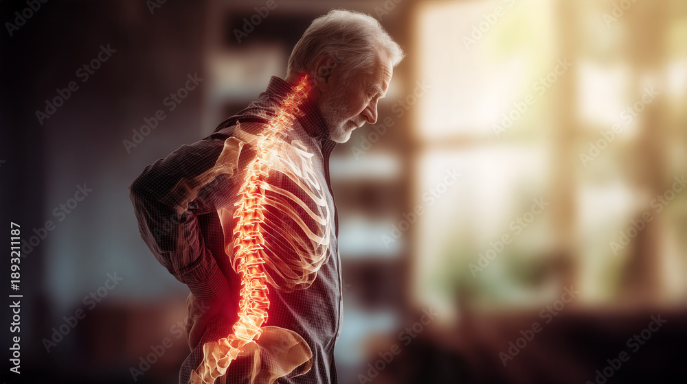 Senior man suffering from back pain with highlighted spine and vertebrae, concept of spinal issues and chronic discomfort #1893211187