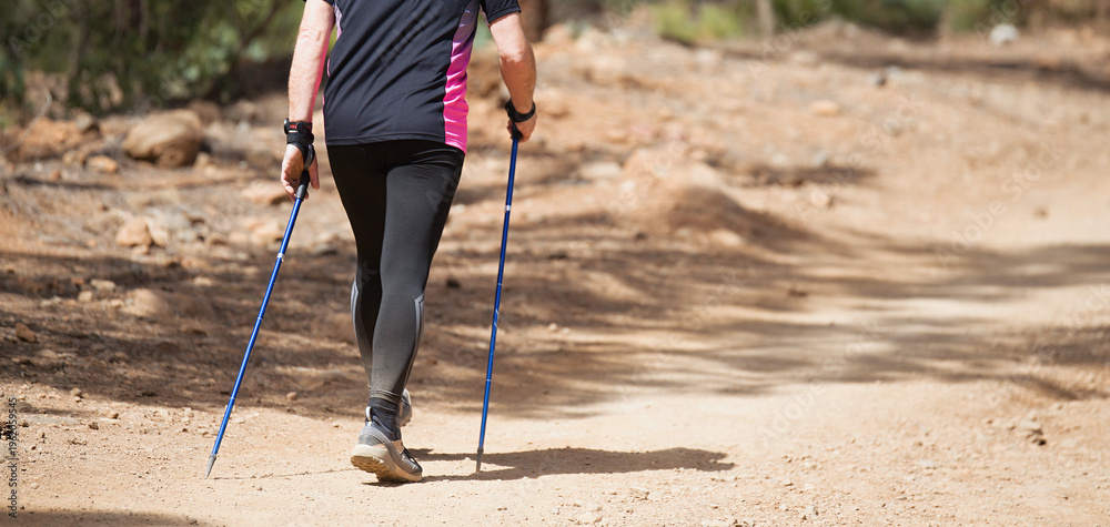 Senior man walking in forest with Nordic walking sticks, sunny summer day. An active lifestyle in retirement, a hike in nature #1962059545