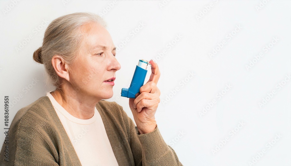 Senior Woman Using Inhaler: A close-up shot of a senior woman using an inhaler, highlighting the importance of respiratory health and medication adherence in older adults. #1083619551