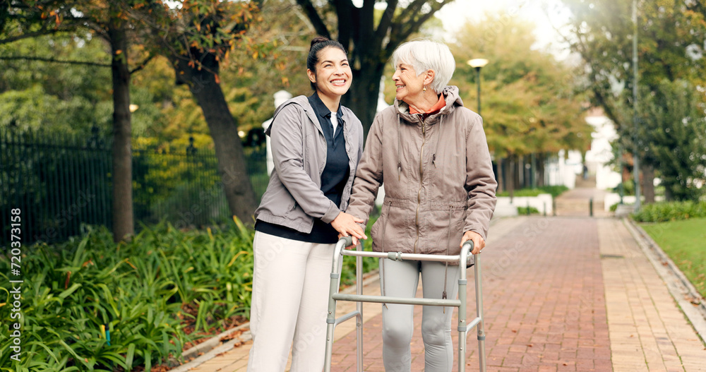 Senior woman, walker and nurse outdoor in a park with healthcare for elderly exercise. Walking, healthcare professional and female person with peace and physical therapy in a public garden with carer #720373158