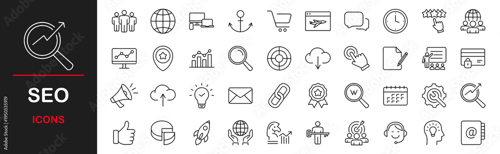 SEO web icons set. Search Engine Optimization - simple thin line icons collection. Containing target, website stats, watch list, marketing and more. Simple web icons set #1950335919