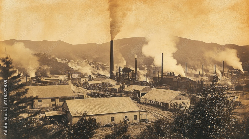 Sepia photo of a bustling industrial town with chimneys and steam filling the air during the 19th century. #1116472439