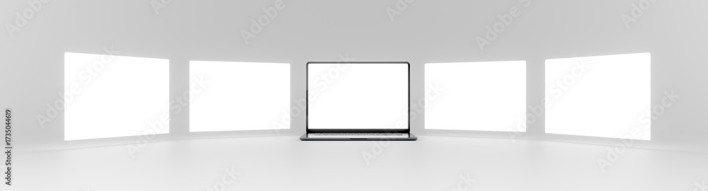 Sequence of five laptop screens with the computer in the center and floating screens on the sides in a white background. Blank template for your website design Ready for mockup. High resolution render #1735044619