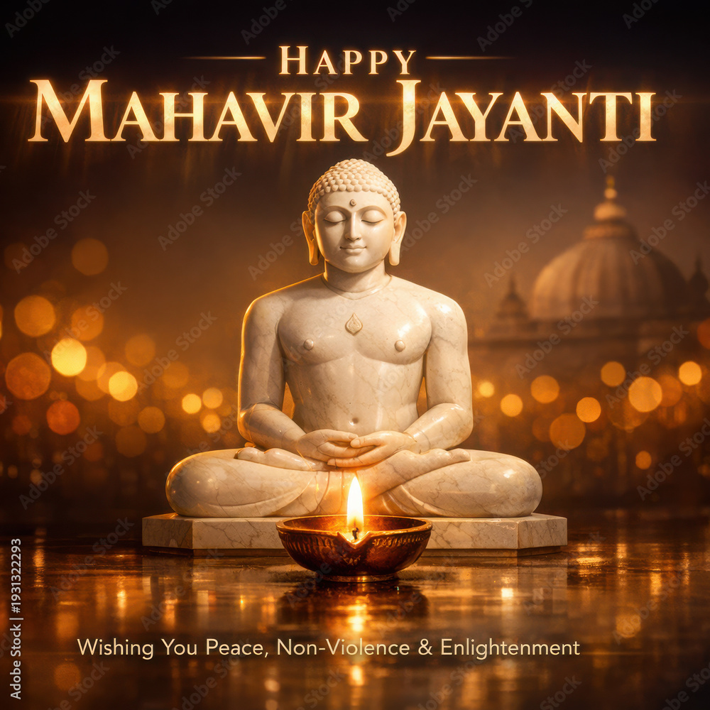 Serene Buddha statue with lit diya and bokeh lights for Mahavir Jayanti meditation #1931322293