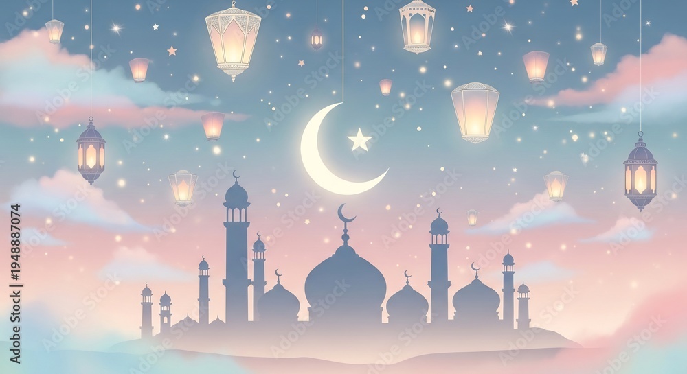 Serene Eid scene with a crescent moon, glowing lanterns, and a silhouetted mosque skyline against a dreamy pastel sky, a digital illustration. #1948887074